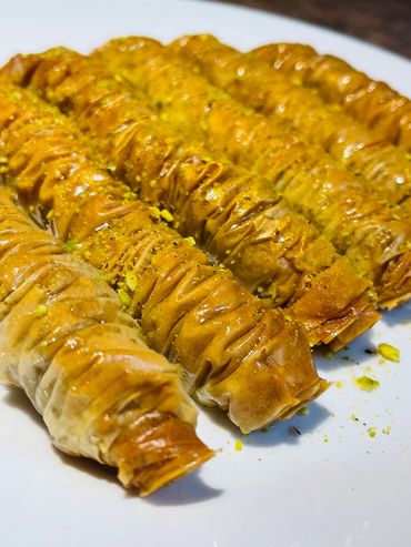 FOUR PIECES OF EITHER CARDAMOM & WALNUTS, OR ORGANIC PISTACHIOS, OR CINNAMON & WALNUTS BAKLAVA.